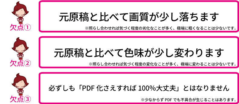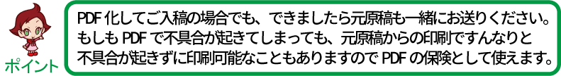 PDFの原稿が印刷使用にほぼ問題がないことの前提条件として、『PDF化したデータをお客様自身で開いて見て、モニター上で問題が無いことが確認できているPDFデータ』であることです。PDF化に失敗したPDFデータでは失敗した状態をそのまま印刷することになりますので、PDF化後には必ず実際にデータを開いて内容の確認をお願いいたします。