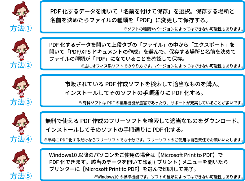 上記の5種類の方法は一般的なものを記しました。PDF化できれば上記の方法以外でもなんでも結構です。ただし一度紙に印刷後にスキャンして再度データ化する方法もありますが、スキャンの際に画質が粗くなる可能性が高いのであまりおすすめはできません。