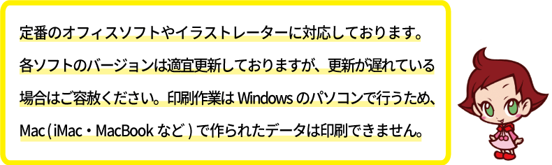 Mac(iMac・MacBookなど)で作られたデータには対応しておりません。PDF化してからの入稿をお願いいたします。