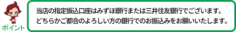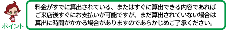 当店でのお支払いは基本的にはご注文作業完了後のお支払いとなります。ご注文内容によっては料金の算出に時間がかかるためですが、すぐに料金を算出できるケースも多くありますので、先払いをご希望のお客様はお申し付けください。また、合計金額が高額(数十万円以上)の場合には前払金(内金)をお願いする場合がございます。
