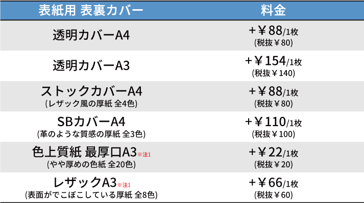 表紙用 表裏カバー 料金