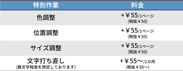 色調整・位置調整等 特別作業 料金