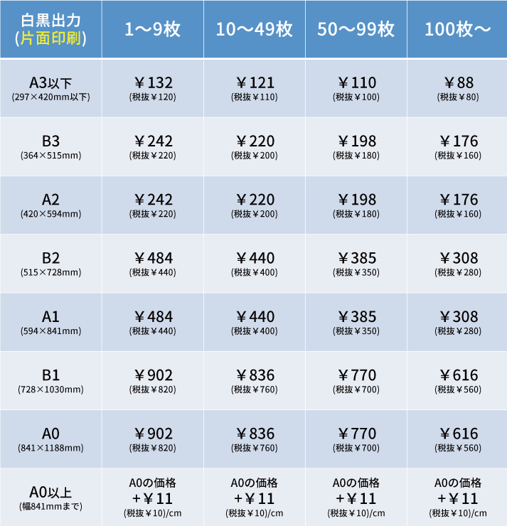 ※同一サイズの白黒出力の合計枚数ごとに単価が変動します。