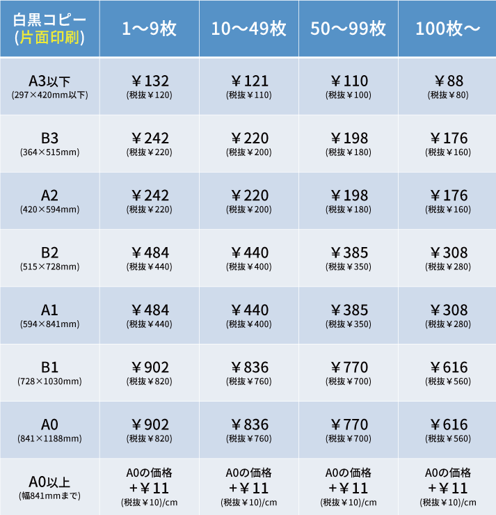 ※長さが1188mmを超える白黒コピーは+¥11/1cm(税抜¥10)です。