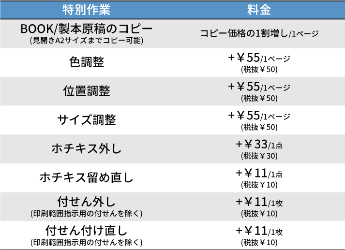 色調整・位置調整等 特別作業 料金