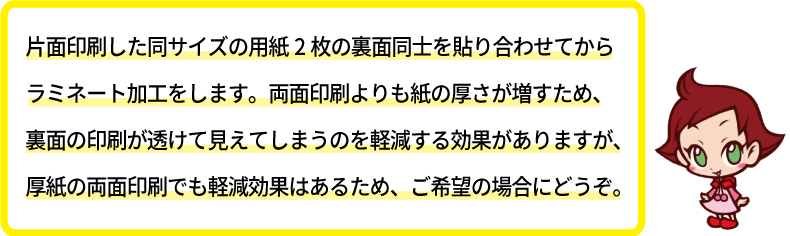 ※片面印刷された紙を両面のラミネートにする場合に必要な加工です。