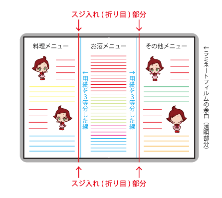 ※赤い線はスジを入れる位置、青い線は用紙を3等分した位置です。