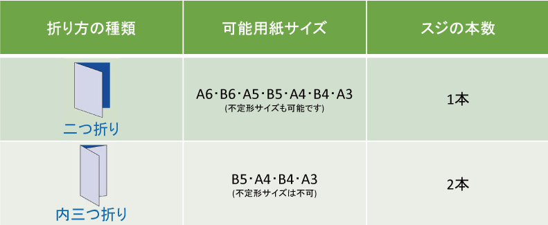 折り加工(スジ入れ加工)の種類と可能用紙サイズ
