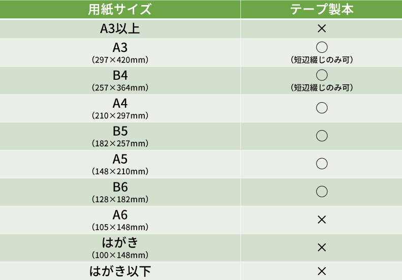 テープ製本が可能な用紙サイズ